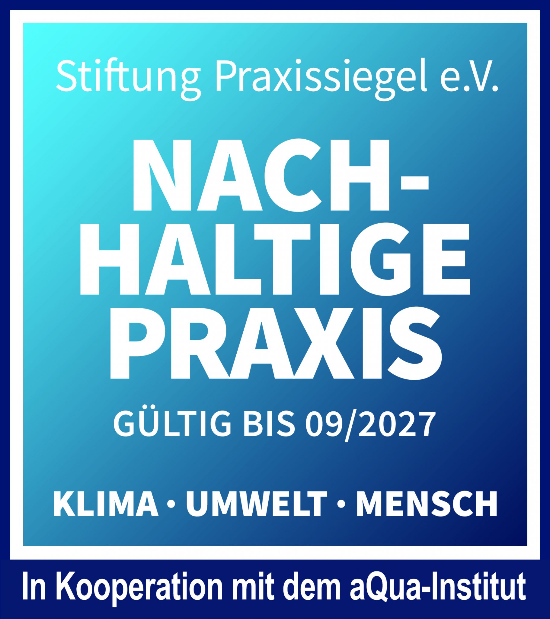 Wir freuen uns, Ihnen mitteilen zu dürfen, dass unsere Praxis mit dem Qualitätssiegel „Nachhaltige Praxis“ ausgezeichnet wurde. Diese Anerkennung spiegelt unser Engagement für umweltfreundliche und ressourcenschonende Arbeitsprozesse wider. Nachhaltigkeit steht bei uns nicht nur im medizinischen Bereich, sondern auch in unserem täglichen Betrieb im Fokus.