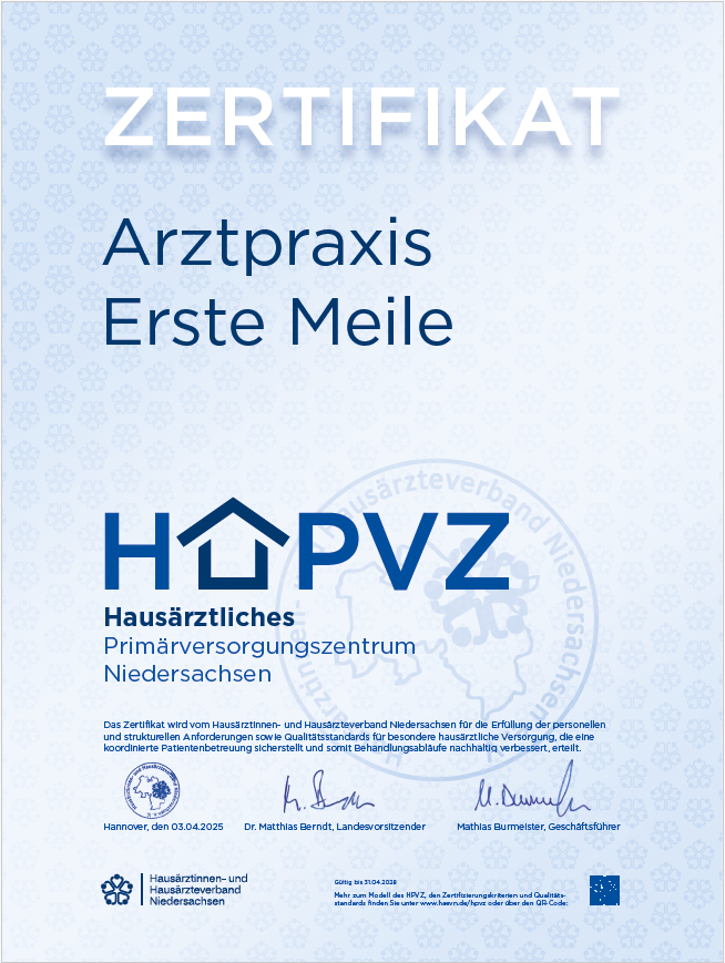 Wir freuen uns, bekanntzugeben, dass unser Hausärztliches Primärversorgungszentrum (HPVZ) in Niedersachsen offiziell zertifiziert wurde!